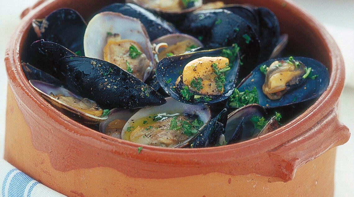 1) Per preparare la ricetta impepata di cozze e vongole lascia spurgare 1 kg di vongole veraci grosse in una terrina con acqua fredda e 1 cucchiaio di sale grosso per un'ora; intanto lava e raschia 1 kg di cozze, elimina le barbine esterne del bisso e sciacquale più volte sotto l'acqua corrente. Preparati quindi per preparare l'impepata di cozze e vongole.