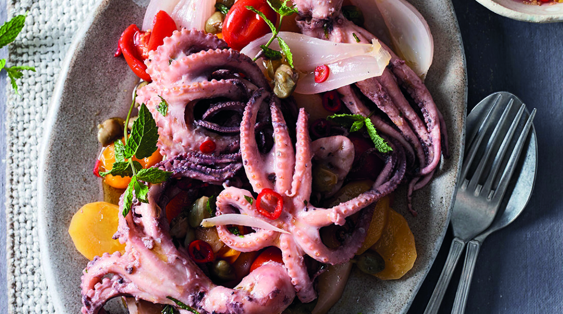 Verdure colorate, capperi e peperoncini avvolgono di sapore questi molluschi. Menta e prezzemolo aggiuntono un piacevole e fresco profumo