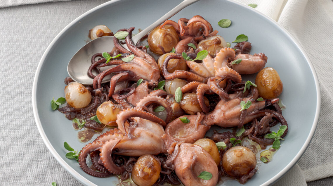 I piccoli molluschi sono insaporiti nelle cipolle rosse, profumati con erbe aromatiche e serviti con cipolline borettane. Un secondo gustoso e light