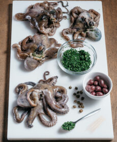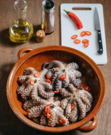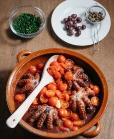 Farciti con un trito di aglio e prezzemolo, capperi e olive, i polpetti cuociono con i pomodorini in un tegame di terracotta. Il sughetto piccante rende il pesce morbidissimo