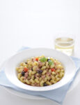 3) Monda le cime di rapa: stacca le infiorescenze e le foglie più tenere e lavale sotto acqua fredda corrente. Quindi sbollentale in acqua salata per pochi istanti; scolale e ripassale in padella con un filo d'olio, lo spicchio d'aglio pestato e i peperoncini.