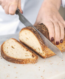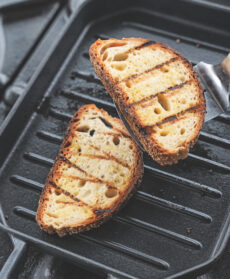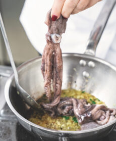 Tagliate il pane a fette mentre continuate la cottura dei polpetti a fiamma bassa per circa 15-20 minuti (in base alle dimensioni dei polpetti), con un coperchio a chiudere il tegame.