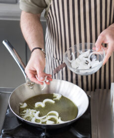 Affettate la cipolla. Scaldate in una larga padella 4 cucchiai di olio, unite la cipolla e fatela soffriggere mantenendola morbida.