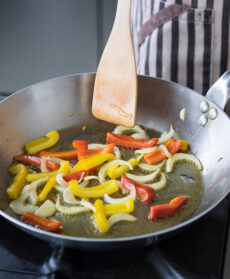 Aggiungete nella padella i peperoni e mescolate con un cucchiaio di legno finché saranno leggermente appassiti. Unite la polpa di pomodoro, mescolate ancora, regolate di sale e pepe e cuocete lasciando restringere un po' il sughetto.