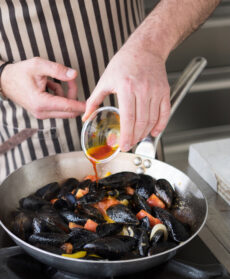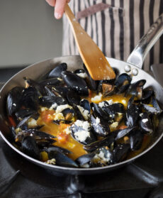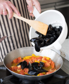 Aggiungete le cozze e continuate la cottura finché i gusci si sono aperti.