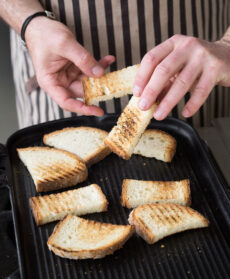 Tostate le fettine di pane. Servite il saganaki di cozze accompagnandolo con il pane tostato.