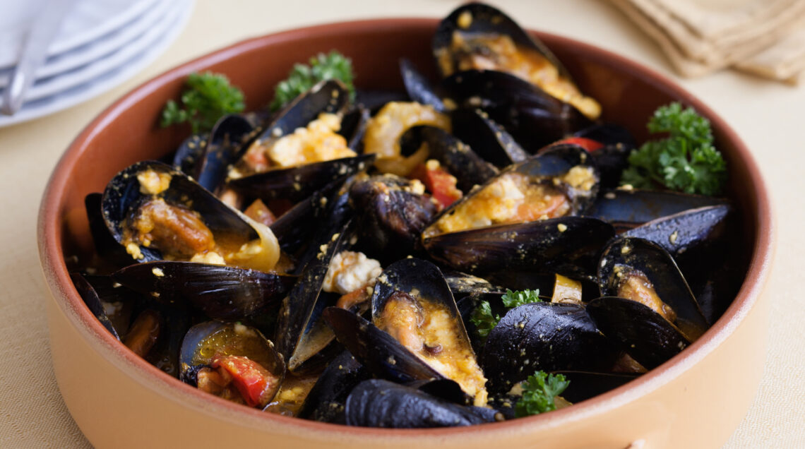 Un piatto della tradizione greca a base di verdure, cozze e feta. Zafferano in tegame e prezzemolo sui molluschi, si serve con fette di pane abbrustolito