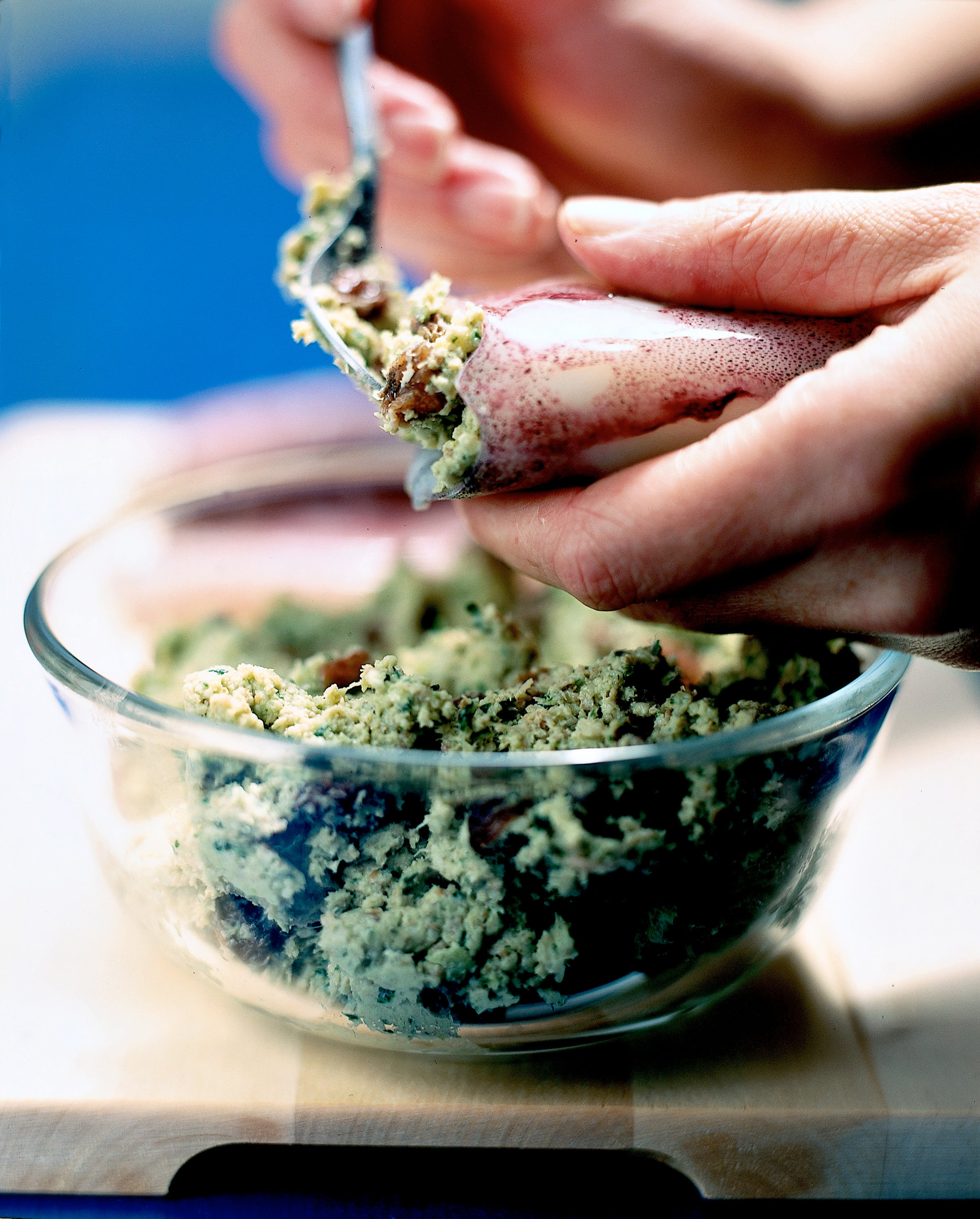 1) Pulisci i totani, eliminando interiora, osso centrale, becco e occhi. Trita uno spicchio d'aglio con un mazzetto di prezzemolo, la cipolla, i gherigli di noce e il prosciutto; unisci un pizzico d'origano e l'uvetta ammorbidita in acqua tiepida, scolata e strizzata.
