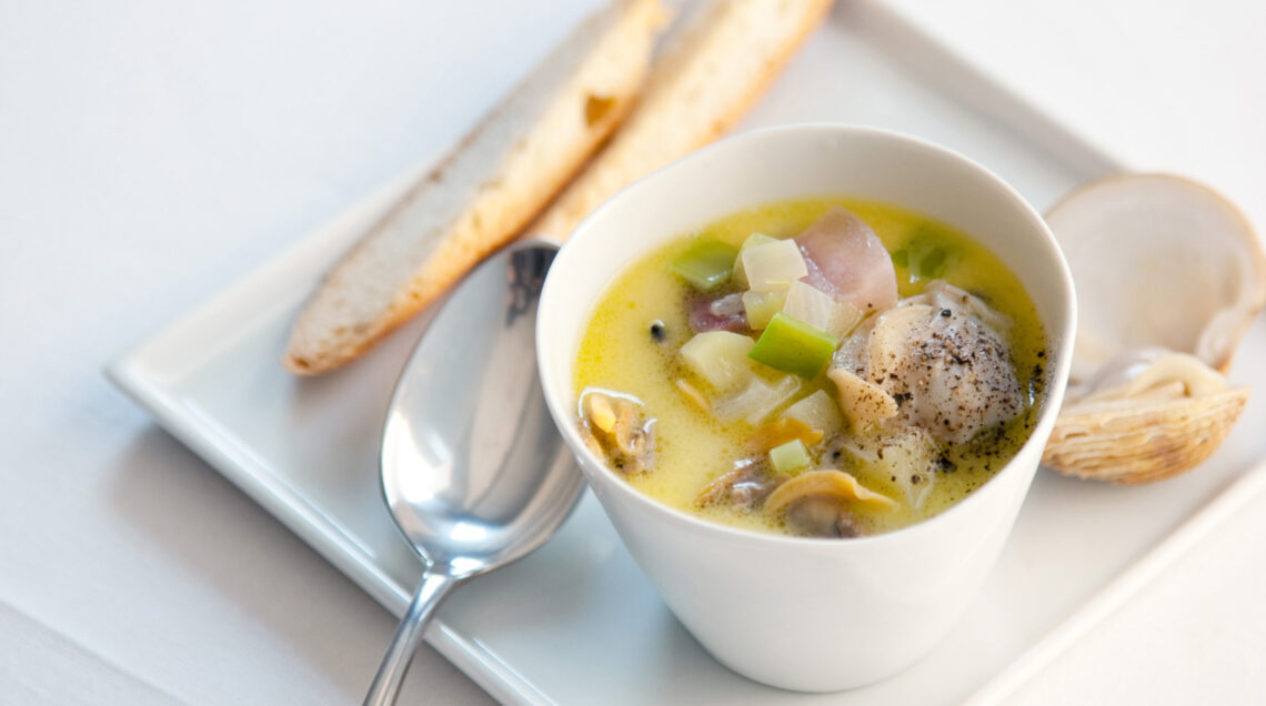 3) Tagliate la baguette a dadini e dorali sotto il grill del forno. Intanto distribuisci la zuppa in quattro ciotoline e servi la zuppa chowder con vongole e tartufi di mare ben calda con i crostini preparati e poco pepe.