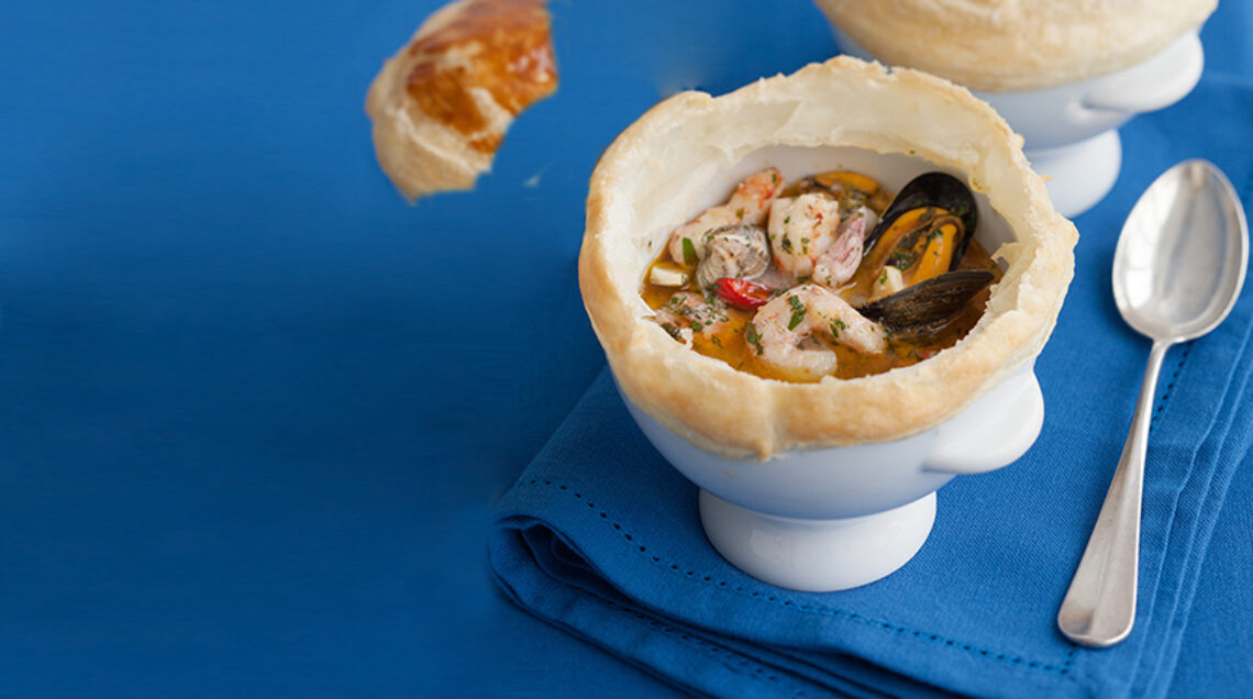 4) Distribuite in 6 zuppierine, o pirofiline da forno, i molluschi sgusciati e quelli interi, i calamaretti, le seppioline, i gamberi rosa e le code di scampi, poi conditeli con la salsina preparata; se vi piace, aggiungete anche un peperoncino.