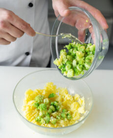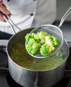 Pulite il cavolo romanesco e tagliate le cimette. In una pentola di acqua bollente sbollentate le patate poi le cimette e scolatele con un mestolo forato.