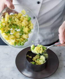 Suddividete il composto in 4 coppapasta rotondi di 10 cm di diametro, riempiendoli fino a circa metà altezza; trasferiteli sulla placca foderata di carta da forno e cuoceteli a 180° per 10 minuti.