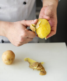 Lavate le patate, scegliete quelle di montagna, pelatele e tagliatele a pezzetti.