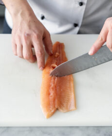Eliminate le eventuali lische, dividete ciascun filetto in 4 parti e insaporitele con un pizzico di sale e una macinata di pepe.