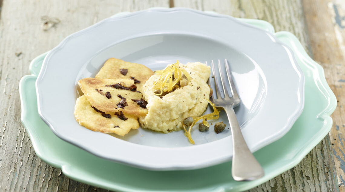 Il pesce d'acqua dolce, mantecato come il baccalà, diventa una spuma soffice e gonfia. Un antipasto tiepido e delicato, servito con croccante alle olive home made