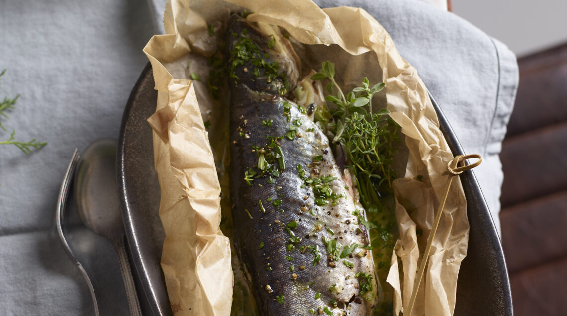 La pancetta tesa avvolge di sapore un pesce d'acqua dolce cucinato in leggerezza con erbe aromatiche. Un secondo preparato con vino rosso