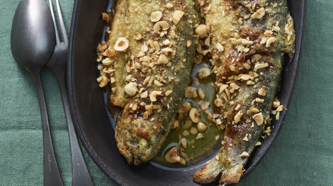 3 Spruzzate con il Marsala, unite le nocciole tritate grossolanamente, cuocete per 1 minuto, poi infornate a 180° per 10 minuti; servite.