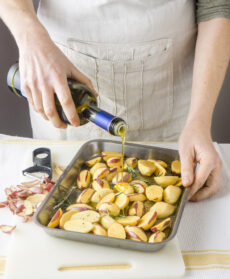 Lavate le patate, pelatele, sciacquatele nuovamente, tamponatele con carta da cucina e tagliatele a metà nel senso della lunghezza. Mettetele in una teglia con un filo di olio, sale, pepe e qualche ciuffetto di rosmarino e cuocetele in forno caldo a 190° per circa mezz'ora, rigirandole di tanto in tanto con un cucchiaio di legno in modo che risultino uniformemente dorate.