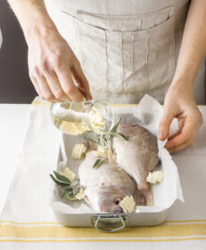 Intanto squamate i pagri con un coltello, eviscerateli, eliminate le branchie con le forbici e sciacquateli. Asciugateli con carta da cucina (anche internamente) e mettete nella cavità di ciascuno 10 g di burro, un filetto di aglio, qualche fogliolina di salvia e sale. Sistemate i pesci in una teglia foderata con carta da forno e unite il vino, ancora un po' di salvia e qualche fiocchetto di burro. Infornate a 190° per 15 minuti.