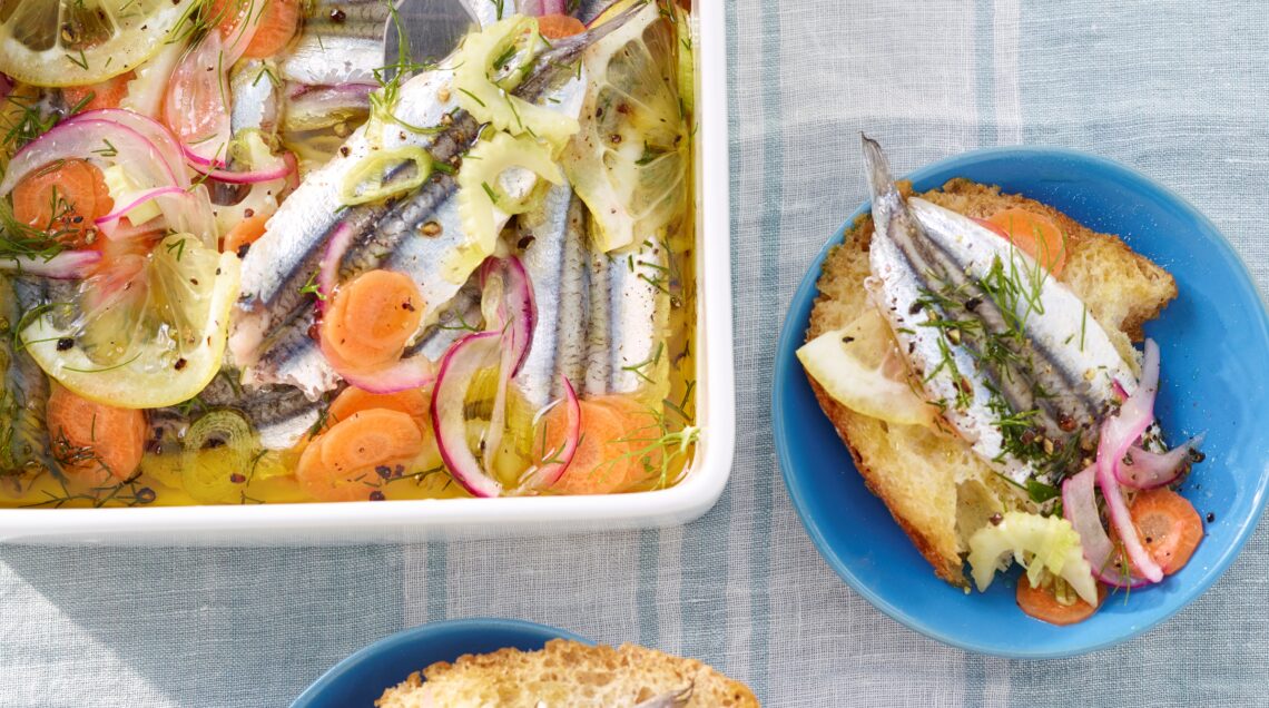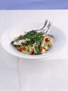 Sgombri alla piastra con finocchi, pinoli e uvetta