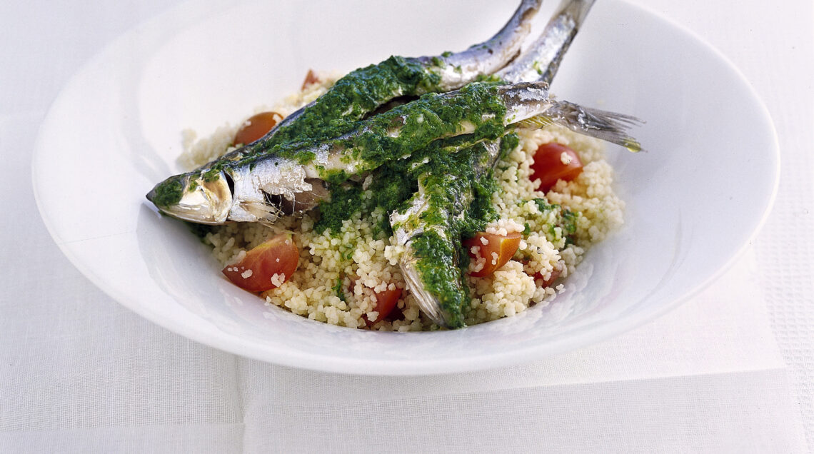 3) Nel frattempo, metti nel mixer la rucola e frullala con l’olio avanzato, sale e una macinata di pepe. Usa il pesto alla rucola per condire le alici e porta in tavola con il couscous.