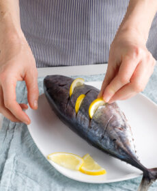 Praticate 4-5 profonde incisioni trasversali sui due lati del tombarello pulito e inserite in ciascuno 1 fettina di limone; irrorate il pesce con succo di limone e un filo d'olio e fatelo riposare al fresco per 2 ore.