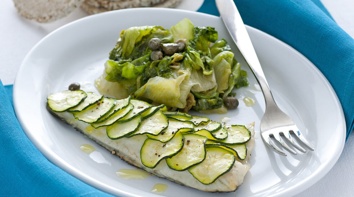 Il verde delle zucchine e della scarola si addice alla gentilezza del branzino. Aglio e capperi aggiungo una nota sapida per un secondo leggero da di gusto