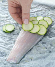 Foderate la placca con un foglio di carta da forno bagnato, strizzato e unto con un filo di olio. Adagiate i filetti ben spinati e regolate di sale e pepe. Copriteli con le fette di zucchina, salate, pepate e irrorate con un filo di olio, quindi cuocete a 180° per 10