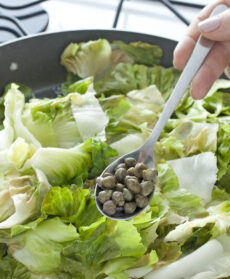 In una padella scaldate aglio, scarola e capperi strizzati. Salate, pepate e cuocete con il coperchio per 10 minuti unendo, se serve, poca acqua calda. Eliminate l'aglio e irrorate con poco olio. Distribuite il pesce e la scarola nei piatti e servite.