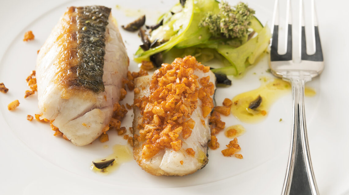 4 A questo punto fate aderire le mandorle ai filetti dalla parte della polpa. Passate la placca in forno a 180° per 5 minuti. Servite i filetti di branzino alle mandorle ben caldi, accompagnati con l'insalata di pomodori verdi.