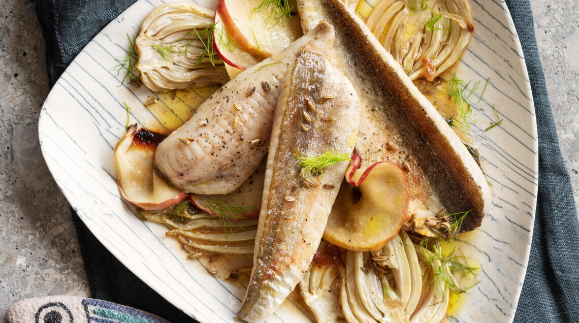 La marinata leggera e aromatica rende il pesce saporito, pronto per raggiungere finocchi e mele in forno. Dieci minuti di cottura, un ciuffo di barbe di finocchio e il piatto è perfetto