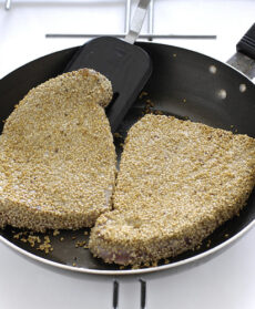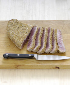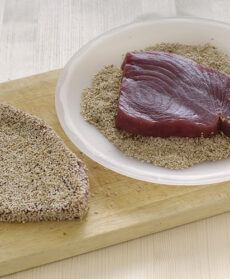 Passate il filetto di tonno nei semi di sesamo, rivestendolo completamente. Premete con le mani, in modo da farli aderire bene il sesamo su entrambi i lati.