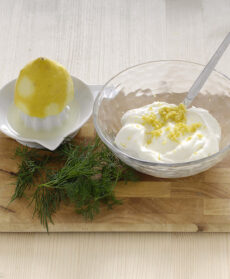 Grattugiate la scorza e spremete il succo del limone. Mescolateli allo yogurt e condite con sale, pepe e aneto.