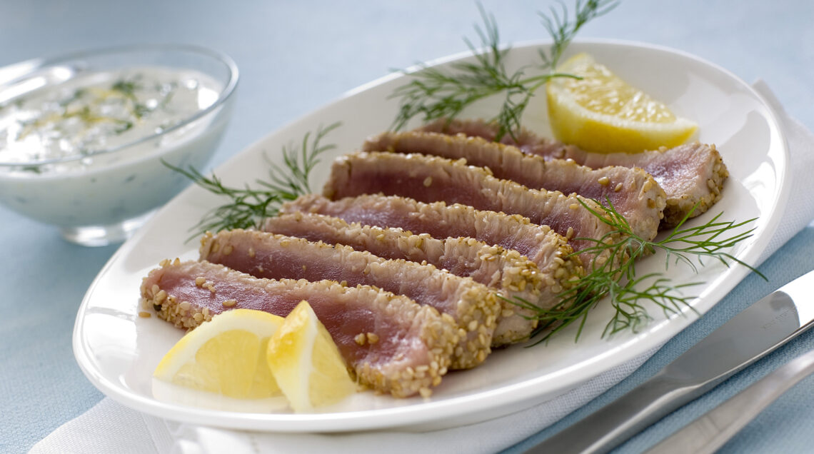 Tagliate a fette il filetto di tonno che deve rimanere rosato all'interno. Trasferite il tonno nei piatti e servite con la salsa allo yogurt.