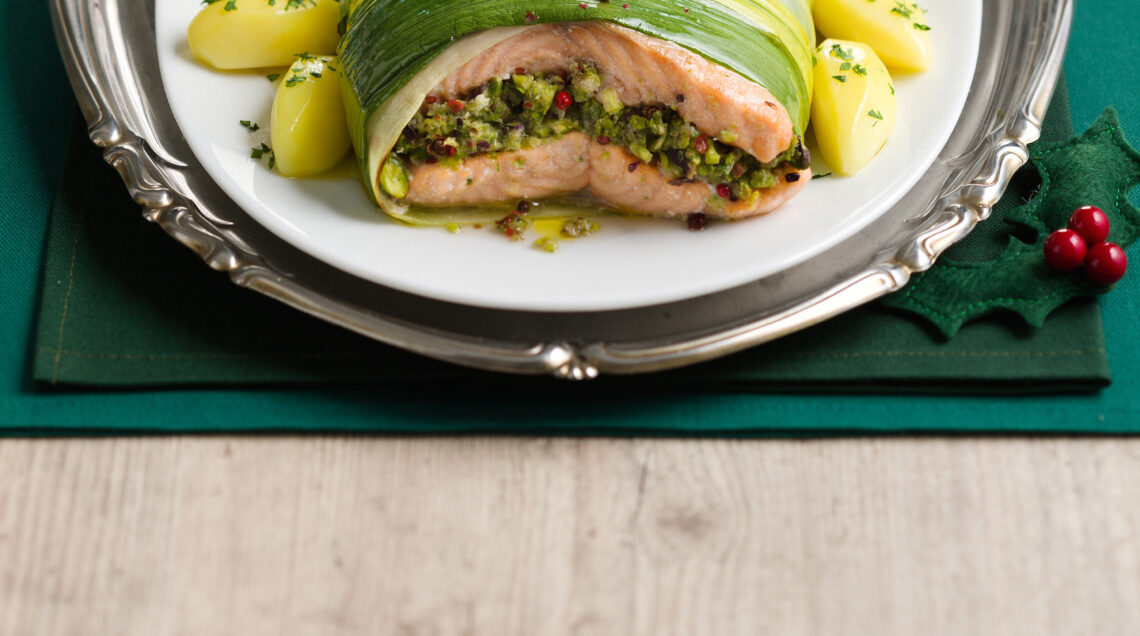 Un piatto raffinato e gustoso a base di salmone, pistacchi e porri. Perfetto per il giorno di Natale