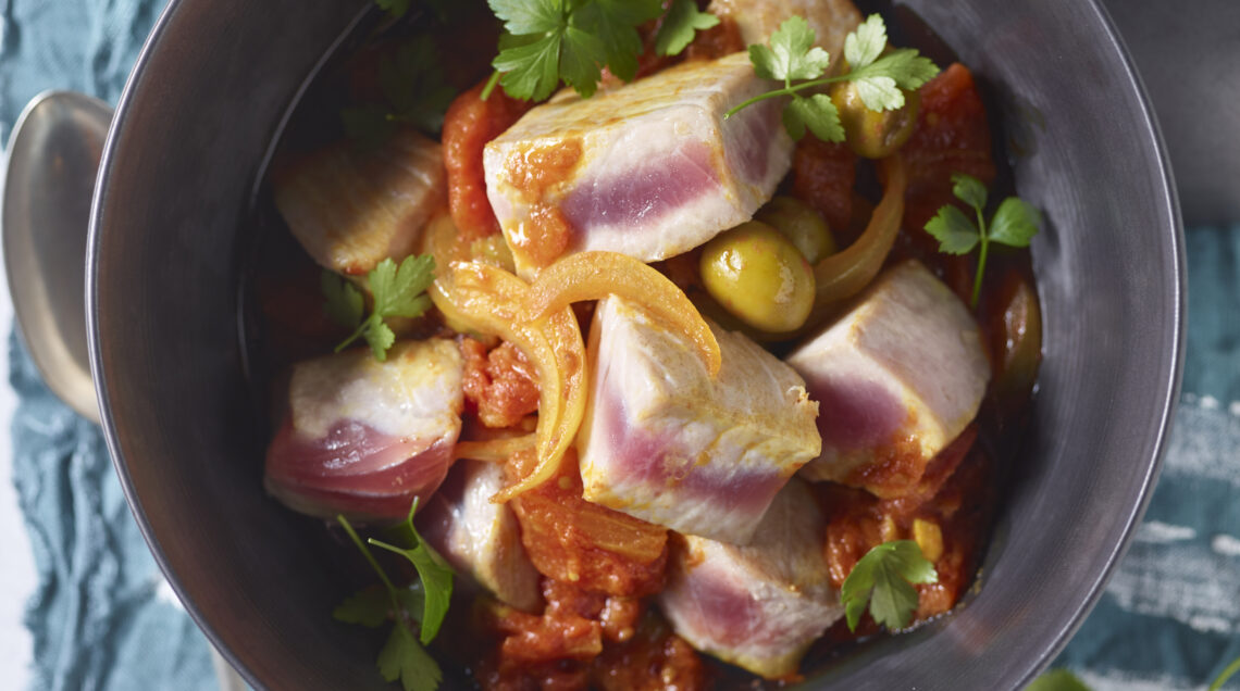 La tajine di tonno alle olive e curcuma è un secondo piatto gustoso, insaporito con pomodori e profumato con zenzero e cumino