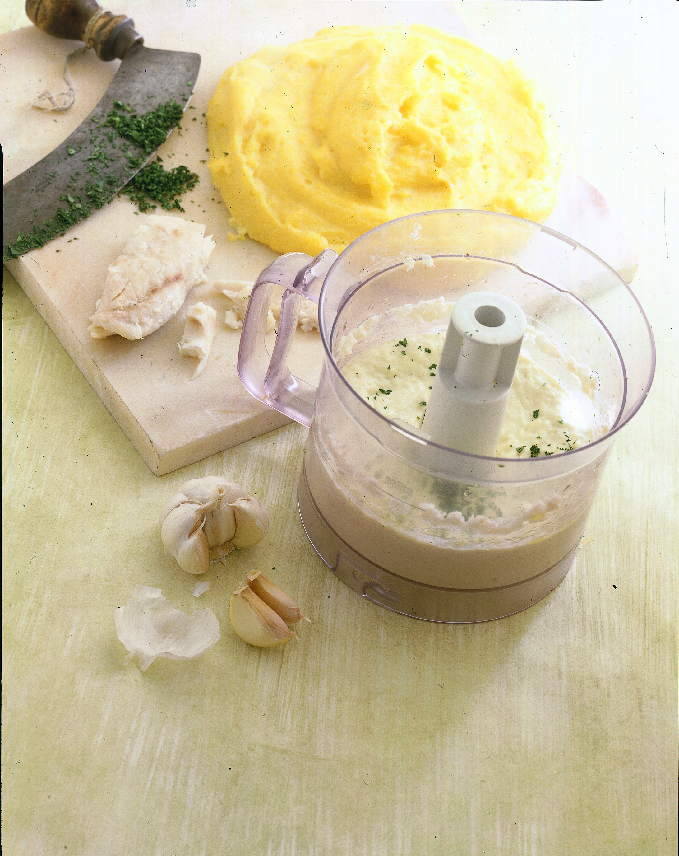 3 Frullate 2/3 del baccalà con l'olio e l'aglio fino a ottenere una crema liscia e omogenea (se il composto risulta