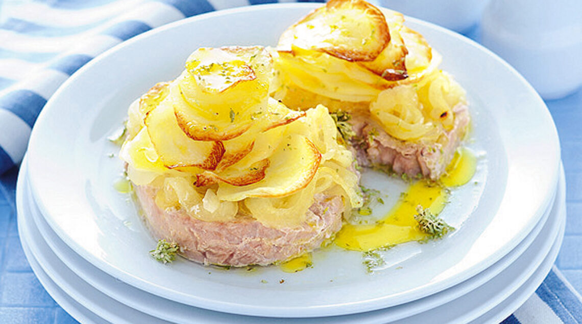 3) Rivesti una teglia con un foglio di carta oleata, disponi le fette di tonno una accanto all'altra e cospargile con sale e pepe. Coprile con le cipolle e le patate, bagnale con il vino, condiscile con 4 cucchiai d'olio e cuocile in forno a 200° per circa 25 minuti.