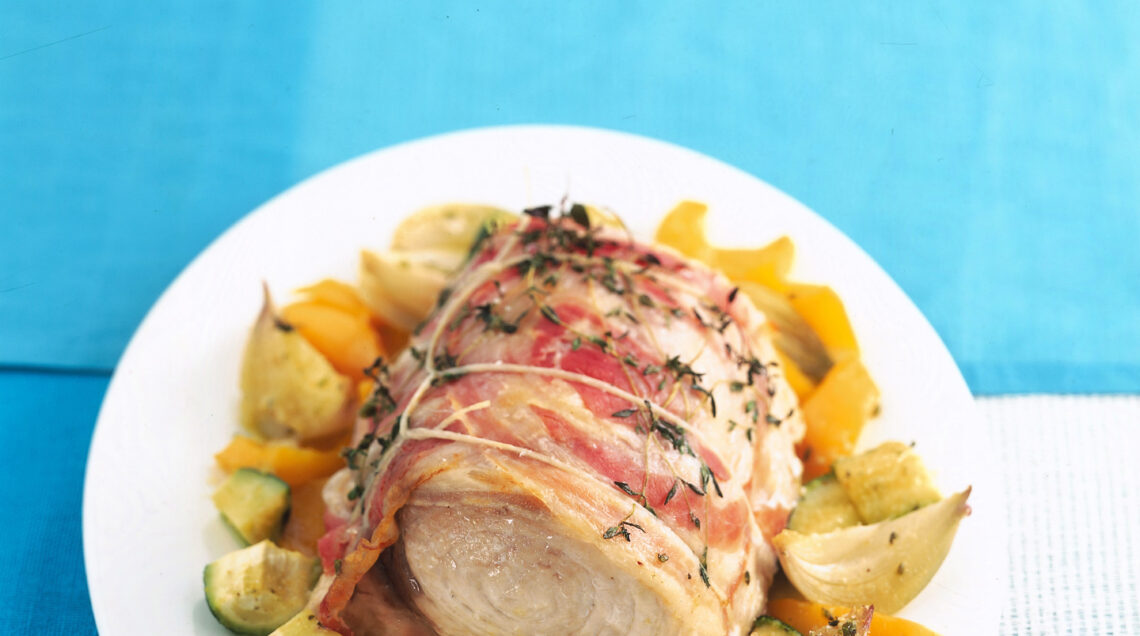 1) Arrotola il trancio di pesce spada con le fettine di pancetta in superficie, aggiungi il rametto di timo e lega l’arrostino con dello spago da cucina, cosicché in cottura resti compatto. Trasferisci il pesce in una teglia da forno, bagnalo con un po’ d’olio e aggiungi lo scalogno tritato. Cuoci il tutto per 5 minuti a 200°, giusto il tempo che l’arrostino inizi a rosolare.