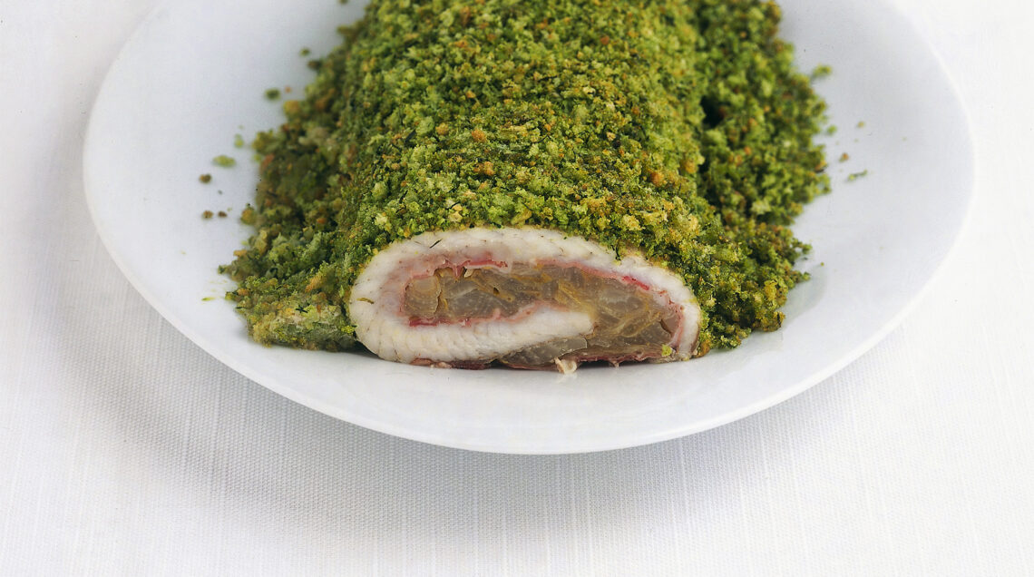 3) Prepara ora il trito aromatico con cui cospargere l’arrotolato di sogliola alle erbe e speck. Passa nel mixer il pane a tocchetti con prezzemolo, timo ed erba cipollina. Copri la sogliola con questo composto, premendo bene con le mani affinché il trito si compatti sul pesce. Condisci con un filo d’olio e disponi l’arrotolato in una teglia rivestita di carta forno. Cuoci per 25 minuti in forno preriscaldato a 180°.