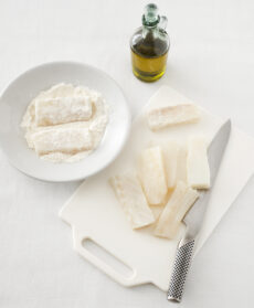 Private il baccalà delle spine e della pelle, dividetelo in 6 pezzi di uguali dimensioni, asciugateli con carta assorbente, infarinateli e rosolateli in padella con qualche cucchiaio di olio. Quando saranno ben dorati, sgocciolateli e fateli asciugare su carta da cucina.