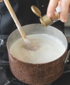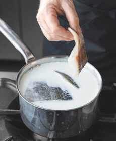 Versate il latte in una pentola e cuocetevi il baccalà per una decina di minuti. Scolatelo con un mestolo forato e filtrate il latte.