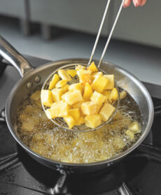Lavate le patate, tagliatele a dadi e friggeteli in una padella con abbondante olio bollente. Scolateli e fateli asciugare su carta da cucina. Salateli.