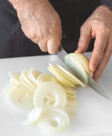 Pulite le cipolle, sbucciatele e tagliatele a rondelle molto sottili con un coltello affilato.