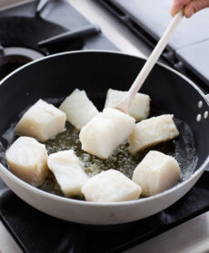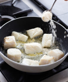 Tagliate il baccalà a pezzi regolari, sciaciateli e asciugateli bene. Mettete il burro in una padella antiaderente abbastanza larga perché ci stiano tutti i pezzi in un solo strato, fatelo fondere, adagiatevi delicatamente i pezzi di pesce e fateli rosolare da una parte.