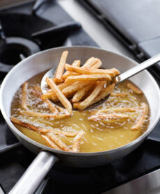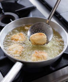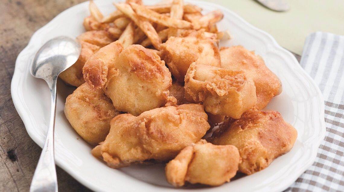 La versione milanese di questa frittura sempre golosa prevede una pastella alla birra, una spolverizzata di grana e l’accompagnamento di croccanti patatine fritte