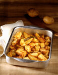 1 Avvolgete le patate in foglii di carta da forno e cuocetele per un’ora a 180°. Intanto, Tagliate il baccalà in tranci spessi e fateli rosolare in una padella con 3 cucchiai d’olio.