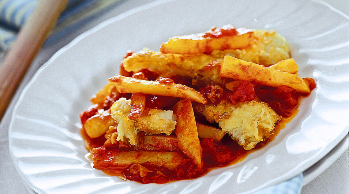 Ricetta della cucina popolare emiliana, questo baccalà è sottoposto a due cotture. Infatti, prima viene infarinato e dorato in padella, poi ripassato in un sugo di pomodoro con patate a bastoncini.