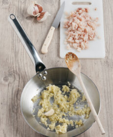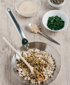Eliminate l'aglio, unite i dadini di spada e fate rosolare per qualche minuto. Trasferite il tutto in una ciotola, aggiungete il pangrattato, 1 cucchiaio di prezzemolo e il basilico tritati, i capperi dissalati, i pinoli e le olive tritate.