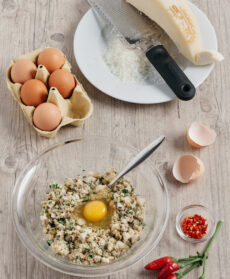 Trasferite il composto in una terrina e unitevi il caciocavallo grattugiato con una grattugia a fori grossi, l'uovo, un pizzico di sale e i peperoncini tritati.